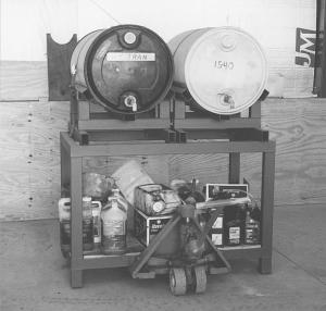 • Oil storage rack. It consists of a storage table and a pair of metal "pallets" that each hold a 55-gal. plastic barrel. One barrel holds transmission oil and the other holds diesel engine oil. "When more oil is needed I can lift off the drums with my skid steer loader and put them in back of my pickup so that I can have them refilled by my bulk oil dealer. Each barrel sets on just three pieces of steel tubing. I recommend anyone who uses plastic barrels to make a full cradle under the bottom side of the barrel, as I found my plastic barrels tend to bulge whenever they're full of oil which could cause them to break," says Hach.