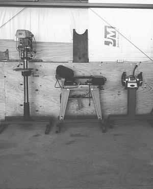 • Movable shop tools. Hach bolted a wide metal stand onto most of his power tools, including his bandsaw, drill press, and wheel grinder, so that he can move them with a pallet jack. He even bolted a stand onto an electric cord reel built out of an old car wheel rim. "The cord is long enough that no matter where I plug it in I reach anywhere inside my shop. I can also move the cord stand outside on the concrete apron in front of the shop."
