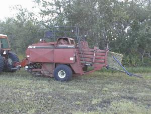To build his unit, Toews modified a Hesston 4755 medium square baler by removing the feeding mechanism and replacing it with one he designed to accept bales measuring 14 by 18 by 32 in. long.