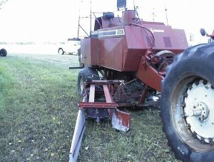 "When the first bale comes into the unit, a shuttle pushes it back onto a horizontal table," Toews says. "This table has automatic switches on it so that, when the second bale comes in, it stands both of them up so they're sitting vertical. A cable elevator below them is timed to the plunger, and when the plunger is at its most forward position, the cable elevator lifts the two bales up in front, directly in the face of the main baler plunger. The plunger pushes those two bales back into the bale chamber. When it has accumulated 12, it ties them together just as if they were loose hay."