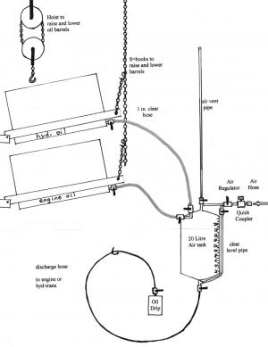 He used a "carry air" portable tank to make an oil reservoir, running a clear plastic tube up one side with measured levels marked on the sides. That way he simply pours a measured amount of oil into the small tank from the barrels, the closes the barrel valves and opens the air valve to push oil out to a length of tubing. He uses approximately 20 psi. An air regulator is needed where air goes into the tank. An air vent tube goes out the top.