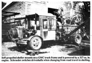 To build the machine, Schroeder started with the chassis from a 2-ton 1954 GMC truck. A Chevy 327 motor with a 4-speed transmission provides the power. Both road drive and shelling are belt-driven. It's set up so that when changing from road travel to stationary shelling, he simply switches drive-shafts. The motor runs at 2,100 rpm's when shelling, burning 21/2 to 3 gal. of gas per hour.