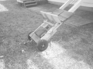 Dietsch used 2 by 4's for the sides with scrap lumber for spreaders. He mounted tracks for a garage door opener to the inside of the 2 by 4's and used chain from two used openers he bought for $35. He needed enough length to extend from the base to the upper end and back to the garage door opener motor that he mounted at the base.