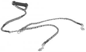 The two-part leash comes with short elastic sections and three separate swivel points that allow two dogs to walk without getting tangles. The leashes lead to a T-bar style handle.