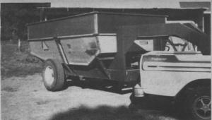 The new box, now with a capacity of 330 bu. is mounted on a 5th wheel trailer which also is made of salvaged materials. The trailer main frame is built of 10 in. bridge channel iron, and the axles are I-beams. Wheel spindles came off a pull-type combine and wheel rims off an old truck.