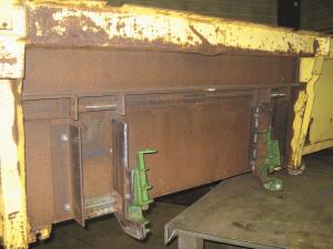 He first stripped down the header by removing the pickup (which he moved to one of his Deere headers), and the large conveying auger (which he sold for scrap iron). Next, he added 1/4-in. thick steel to the sides to strengthen the relatively light-gauge ends of the header.