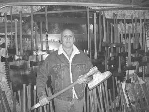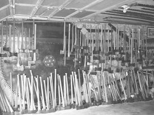 McPhail puts a light coating of motor oil on the steel ax heads. About 10 to 20 percent of his axes have their original handles, usually made of hickory or ash.