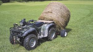 The patent pending Hay Baby lets you load and unload bales without ever leaving the driver's seat. It rides on turf tires and has an electric-operated winch that's used to raise or lower a bale spear bale. The winch is operated by a remote control mounted on the ATV handlebars and is wired to the vehicle's battery.