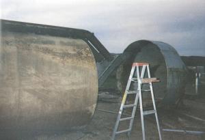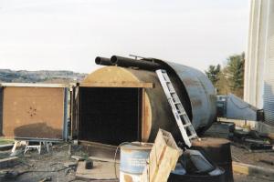 Place surrounded the furnace with a 30-ton feed bin he purchased for scrap price. The fuel tank was too heavy to slide into it, so he cut the bin apart to place part of it on the ground, then covered the top and screwed it securely together.
