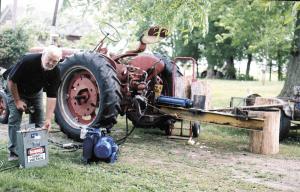 The motor shaft-drives a 2-stage hydraulic pump. The cylinder pushes the log against a 1/2-in. thick end piece that fits onto the end of the beam. The cylinder is activated by pulling on a lever at the back of the tractor.