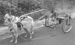 While there are other dog carts on the market, Daphne Lewis says hers has a single shaft that goes over the dog's back and pulls upward on the harness.