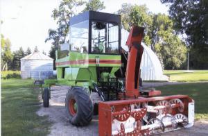 He bought a 1960's Owatonna 260 swather for $900. It was equipped with a Ford Industrial 200 cu. in., 6-cyl. engine with 70 hp. He narrowed the axles by 40 in. to match his mower and snowblower. He made his own cab, using safety glass for the windshield and plexiglass for the side and back windows. He made his own 3-pt. hitch and mounted it on the snowblower. The power shaft was lengthened about 10 in. to reach the swather and snowblower shafts.