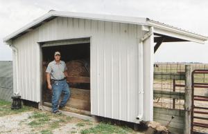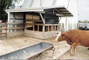 The bale feeder measures 7 ft. sq. and sets on a concrete floor in De Clerck's cattle pen. The cover over the feeder is built from sheet metal and has a pitched roof, with gutters directing rainwater outside the pen. The cover hangs 7 ft. over two sides of the feeder, and 3 ft. in the middle. The fourth side of the cover is a sheet metal wall that forms part of the pen's fence. A rolling, hand-operated fiberglass garage door in the wall is opened to load bales into the feeder.