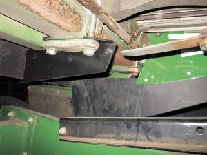 Changes Tim Petersen has made to his Deere combine improve grain and trash handling. His Grain Saver prevents corn ears from bouncing out of the feeder housing. On the underside of chopper-style Deere corn heads, his in-row and between row deflectors keep trash from windrowing to the side.