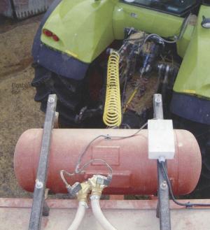 In addition to the knotters, Symes' system keeps the stuffer brake clean. He mounted a small air tank on front of the baler and ran plastic tubing back to nozzles directed at the knotters and the stuffer brake. The blast of air is controlled by a pair of electric solenoid valves connected to a switch in the cab. Symes hits the switch each time the knotter buzzer goes off, keeping the mechanisms totally free of debris. After each blast, it takes the tank about 45 secs to be restored by the tractor-mounted air compressor.