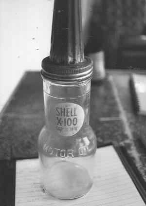 The glass bottles often chipped hitting the engine block, and they were tall (about 18 1/2-in. with a 3-in. diameter base) so they tipped over easily.