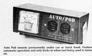 With S & W Industries' new AutoPod III mounted under your car or truck hood, you can draw up to 3750 watts of 120 volt power from the vehicle's 12 volt battery - enough to operate an electric saw, drill or other power tools, or up to 7 500 watt light bulbs. You can also use the Auto-Pod to charge a 12 volt battery to 80% in 5 minutes, or for a wide variety of arc welding jobs.