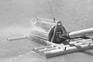 The Riverscreen floats on four pontoons and draws water from more than 35 sq. ft. of screening area. Water is delivered through a pipe available in 4, 6, 8, 10, or 12-in. dia. with 150 gpm to 4,000 gpm capacity. A screened, rotating drum measuring 32 by 48 in. is supported by an aluminum frame that mounts on the pontoons. Flowing water moves past a series of paddles, which force the drum to rotate and self-clean via a stainless steel mesh screen. As the screen rotates with the drum it goes by a series of jets, which dislodge anything that sticks to the screen.