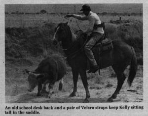 He's still able to work cattle, thanks to a custom-built saddle that consists of the back from an old school chair with pipes bolted onto the back. The pipes slip into holders mounted on the back of the saddle, and on the back of the "chair" are sewn two large straps of Velcro that wrap around Bess' midsection.