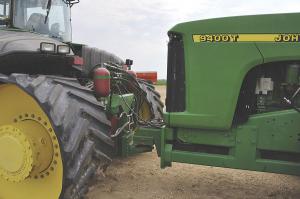 Joining the tractors involved developing a heavy-duty hitch that mounts on the drawbar of the front tractor. It’s designed to move up and down to accommodate movement between the coupled tractors. The hitch incorporates a pair of hydraulic cylinders and accumulators that provide dampening of movement. The hitch can be locked hydraulically when the front tractor is used for other tasks as a single unit.