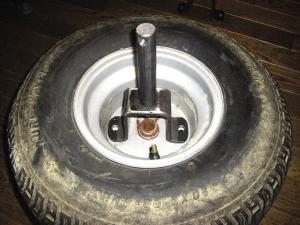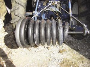 A wide variety of adapter kits are available, allowing you to mount weights on a tractor’s drive wheels or on the front, back or sides of the tractor. The adapter he designed to mount weights on wheels includes a pair of cross member brackets made from 1/4-in. thick steel, and a threaded steel rod that fits through existing 1-in. holes at the center of each weight. You bolt the cross members to 4 existing holes in the wheel, and then add the weights onto the rod in increments.