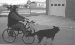 A telescoping pole lets his dog pull from the side of the cart. It connects to a harness at the front of the cart. The operator steers with his feet.