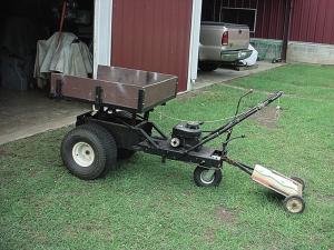 He even has a place for weights. After spinning out on a wet hillside, Forster discovered he could make it with an 80-lb. bag of cement placed in an open space over the transmission. He even built a small surrey to stand on out of a piece of plywood, a couple of pieces of bed frame and two walk behind, lawn mower wheels.
