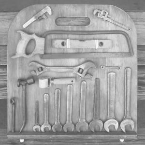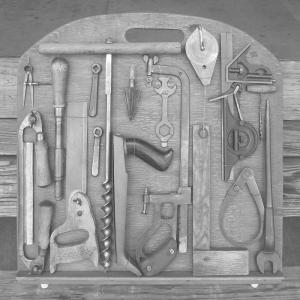 Several years ago, he decided the tools weren’t doing anyone any good sitting in boxes in his garage, so he started making 20 by 20-in. panels out of 1/2-in. plywood. Narrow shelves secured with brass screws on the bottom support the tools along with thin wire slipped over the tools through holes in the plywood, and twisted tight on the back. With artistic layouts of similar tools, a rounded top and nice stain, the displays are attractive and portable with a handy slot at the top to carry them.