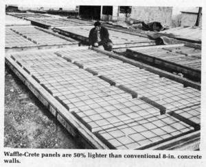 Here are some of the features of Waffle-Crete as related to poured concrete: An 8 by 12 ft. solid panel of normal concrete would weigh 9,600 lbs. A Waffle-Crete panel of this size, made of lightweight concrete, weighs just 3,300 lbs. At the same time, it is engineered to have the same strength. (In some areas, conventional concrete, not lightweight concrete, is used in Waffle-Crete panels.)