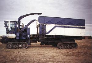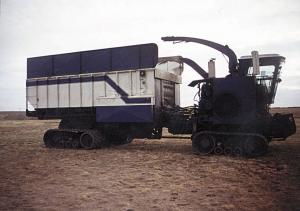 The machine works on the same principle as any self-propelled forage harvester except that you can keep harvesting with-out a truck or wagon alongside by blowing silage into the rear hopper. There are four sets of hydrostatically-driven tracks on the machine. The front tracks are 30 in. wide and the rear are 36 in. wide. The chassis was built completely from scratch with an articulated steering joint at center. The engine, cutterhead, knife and feed rollers came off an existing machine.