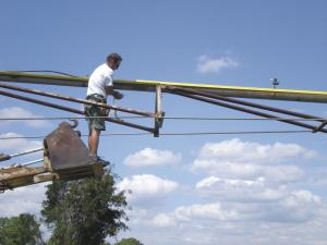 Yiannakis and his partners started the company, Pivot Protection, to install their anti-theft system. They take a bandsaw to the field to cut the angle iron to length, and it takes 45 min. to an hour per tower section.