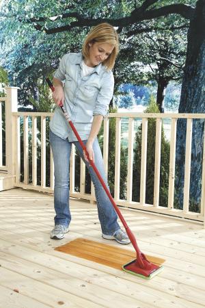 Shur-Line (www.shurline.com) recently introduced the Shur-Line Stain System, which holds 1/2 gal. of stain or sealer in a canister. Pull a trigger on the handle to release stain into a pad that glides over the deck. Retail cost at major home supply stores is $35.