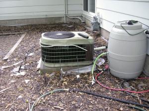 He sets up a rain barrel to catch water (275-gal. chemical totes work well) and installs a small 12-volt pump unit. A current switch mounts on the air conditioner. The AC power lead goes through the current switch, which activates the pump, sending water to a wand aimed at the AC fins.