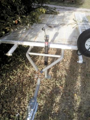 Witt built his 6 by 12-ft. trailer to haul his ATV and golf cart. He used 2-in. steel tubing for the frame and expanded metal for the bed, and he purchased new ramps. The axle is a rubber torsion axle – a 2 1/2-in. square tube with a 1 1/4-in. solid shaft inside with hot rubber poured between to make it solid. The 8-in. rim wheels have mounted motorcycle springs and shocks. Witt used 4-in. square tubing for the wheel swivels with a 1-in. bolt and 6-in. turntable plates.