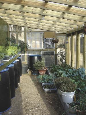 Inside the greenhouse, there’s an in-ground planting bed as well as a planting shelf that sits atop a row of 55-gal. plastic drums, painted black and filled with water. The water warms up during the day and gradually releases the heat into the greenhouse at night, creating a moist, warm environment – perfect for growing fresh vegetables.