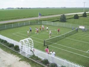 Court Of Dreams Brings Tennis Players To Iowa Farm FARM HOME Miscellaneous If you’ve seen the Field of Dreams baseball field in Iowa you’ll know why this meticulously-groomed tennis court – also carved out of an Iowa corn field – is called the “Court of Dreams” by folks who’ve seen it What’s great about the grass tennis court built and maintained by Mark Kuhn and his family is that anyone can play on it for free All you have to do is let them know you’re coming and then make the drive to Charles City Iowa When Kuhn built it he had no idea it would attract players from 35 states He built it in 2002 to satisfy his curiosity about Wimbledon’s grass tennis courts Kuhn and his family spent 16 months installing drainage tile and sprinkler heads leveling 17 truckloads of sandy soil picking rock packing the soil and planting bentgrass which is commonly used on golf greens The family hosted a tournament for college tennis players in 2005 and the resulting media coverage including an article in Tennis magazine netted calls from all over the country “There are so few grass courts left ” Kuhn says noting that playing on grass is slightly different as tennis balls don’t bounce as high “It’s very easy on your body I had a major farm accident a few years ago and rarely play anywhere else I play almost every day when I can and I get a variety of partners and meet a lot of people ” Maintaining a grass court requires commitment and a lot of work It takes about 40 min every day or two to mow the grass to its ideal 7/16-in length At the end of the 2012 season the Kuhns removed thatch and worked in 7 tons of mason sand to improve and firm up the court for 2013 Each year they add improvements such as cutting painting and installing the 757 pickets for a fence that surrounds the court The fence is green on the inside and white on the outside Along with hedges flowers and other features the lawn court stands out next to the Kuhn’s corn and soybean fields Reservations are required by emailing the Kuhns through their website for the Memorial Day through Labor Day season They have vintage and new rackets available Kuhn adds that he is consulting with property owners in Minnesota and New Hampshire who are building their own lawn courts Information and photos about the process are also on the Kuhn’s official website for their “All Iowa Lawn Tennis Club” Contact: FARM SHOW Followup All Iowa Lawn Tennis Club 2667 240th St Charles City Iowa 50616 ph 641 330-4910