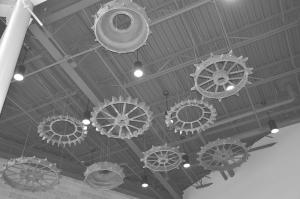 “I told the architect that I could get tractor rims and that people will recognize them and think they’re cool,” Bancroft says. The rims came from a variety of tractor models: Deere, Farmall, Allis-Chalmers and Fords.