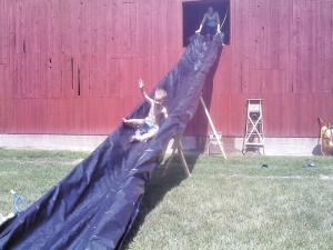 Early this summer, when the weather turned hot and our family started getting irritated with each other, I fashioned a 30-ft. long water slide to stretch from the hay mow in our barn out into the yard. Using some old poly barrels reclaimed from a friend’s barn, and some discarded 2 by 4’s from our wood shop, we found a way to beat the heat and save a trip to the water park.
