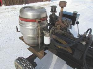 The 17 hp Wisconsin 2-cycle engine that starts with a hand crank came off an old baler. He made the front wedge out of an old locomotive shaft and purchased the 8-in. steel beam, car axle and tires (“donut” tires) from a local junkyard. Ingerson purchased a two-stage pump, and his son built the fuel tank.