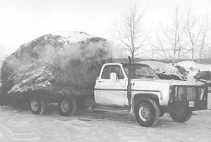 "The only disadvantage of a truck-mounted Stak Mover is that in very muddy feeding conditions even the 4-WD truck doesn't have adequate traction so I have to use my original pull-type Stak Mover, which I kept for that reason. As a safety precaution, I rerouted the exhaust muffler out the right side of the cab and straight up to keep sparks off the hay. I also mounted lights on top of the truck cab."