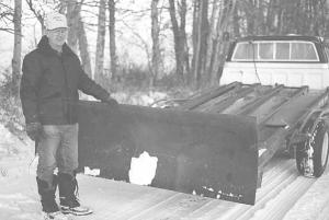 Glebe used 1/4-in. thick steel to make the quick-tach snow blade. It attaches with two bolts to a pair of angle iron plates that bolt on top of the Stak Mover frame. He simply tips the mover and puts the truck in reverse to clean snow out of his yard and away from the stacks.