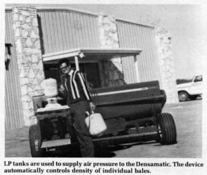 claims the Densamatic will "run circles around hydraulic systems for controlling bale density and costs about half as much." His invention uses air pressure to determine density. Simply turning a valve to change air pressure changes bale density. Air pressure (60 to 70 lbs.) is supplied by portable LP gas tanks.