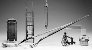 A set of smaller samples, including 2 pitchforks (one with an original canvas cover, point protector and metal hang tag), toboggan, pulley, nesting tubs, wooden extension ladder, and axle sold for $2,070.