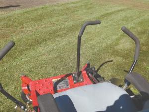 Getting on and off zero-turn riding mowers can be tricky. A new support arm called the DONBAR makes it easier for operators of all ages.