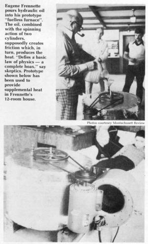 It all started during the winter of 1977-78. It was costing Frenette, father of 12 children - 10 of whom are still at home - a whopping $230 a month to buy fuel oil to heat his huge, old, uninsulated 12 room "Pillsbury mansion" in Londonderry, New Hampshire. He launched a crash program to perfect his invention -a simple but unorthodox 'fuelless' furnace which he maintains will be able to heat an average size home for only 50 cents a day and which he feels can be retailed "for $600 to $800".