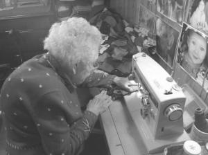 She learned to sew on a treadle machine before she was married. Now she sews on an electric Kenmore sewing machine, but she still cuts out 4 1/2-in. squares with scissors.