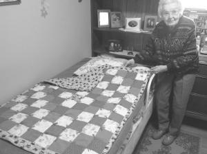 Madsen says she helps Farrell occasionally, yet she marvels at how accurate the centenarian quilter is. Farrell sews the squares together, then lays out the flannel backing and batting on a bed to pin it together. After sewing it around the edges she can relax in a chair to tie the quilt.