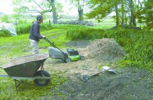 The problem is that the soybean residue is too coarse and bulky to handle easily. So he makes a pile of residue and chops it with his lawn mower, collecting it in the mower’s bag.
