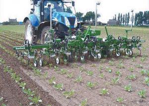 “I solid-seeded wheat, rye, barley, flax, peas and beans. Our drill was set for 6 1/2-in. rows, and the Robocrop has 4-in. shovels. It works well and doesn’t take out any of the crop. The pattern recognition software activates the weeding rotor to take out weeds between the plants in the row. I can cultivate about 11 acres an hour with the 22-ft. machine.