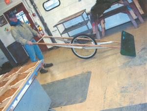 He used 1 1/16-in. thick sheet metal to fabricate the shovel, which is 5 in. high at the back and has a replaceable cutting edge. The oak handles bolt onto aluminum angle iron brackets on back of the shovel. A pair of angle irons extend from the handlebars to down below the wheel. Both angle irons are bolted to the bicycle wheel’s axle using the original axle bolt. An angle iron brace at the top of the handlebars provides reinforcement.